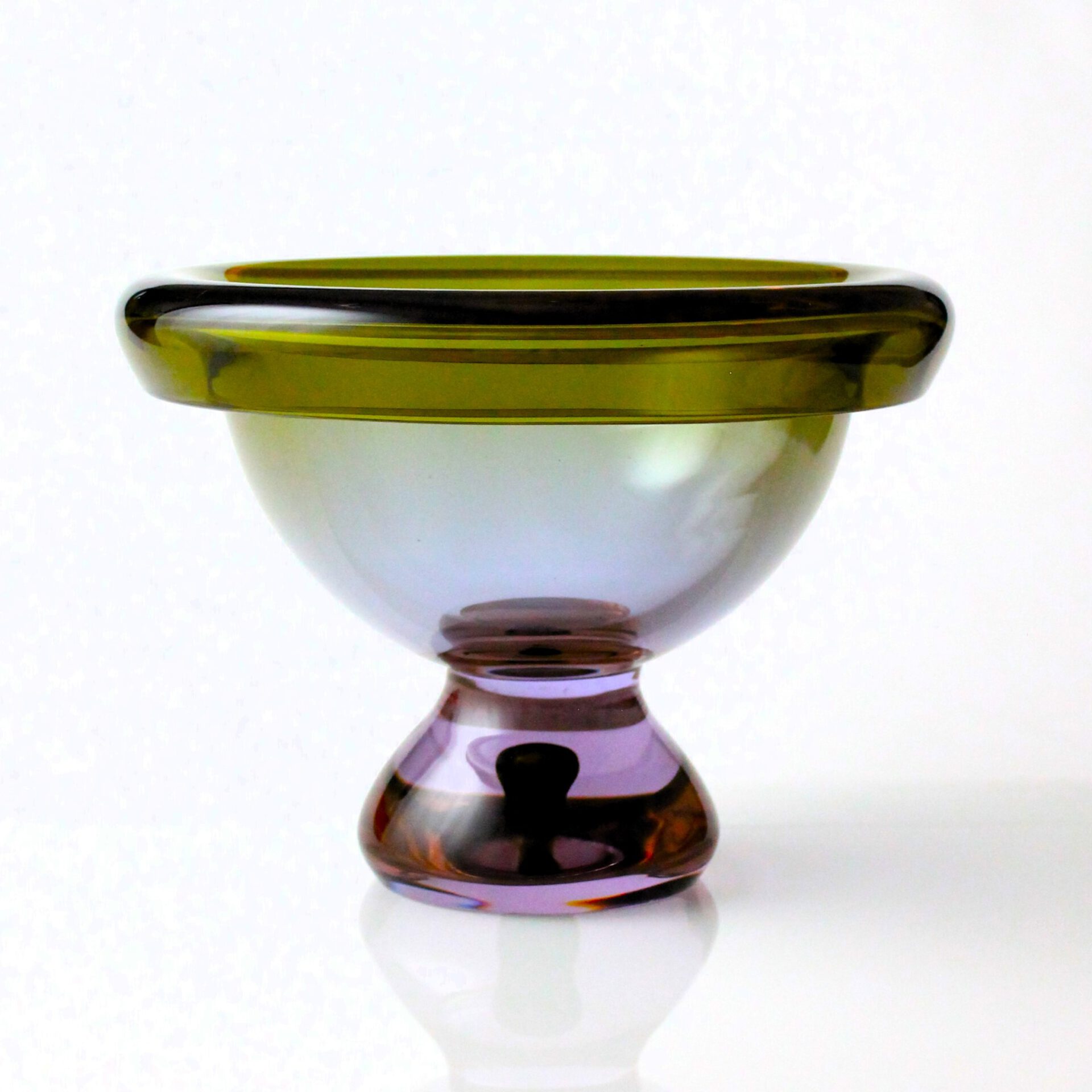 Hergestellt bei Gino Cenedese & C., Murano-Italien. Alexandrit-Uran-Glas mit komplexem Farbverlauf von oliv bis fliederfarben. Massiver Stand aus Alexandrit-Gas mit drei olivfarbenen Fadeneinschmelzungen und einer eingestochenen, olivfarben überfangenen Luftblase. Kragenförmig nach unten umgelegter Schalenrand. (Entwurf und Ausführung: Antonio da Ros)