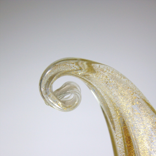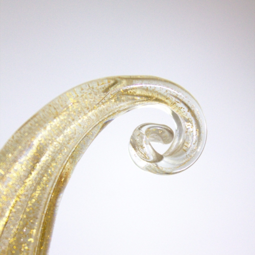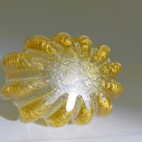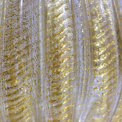 Hergestellt bei Vetreria Barovier & Toso, Murano-Italien. Farbloses Überfangglas mit eingeschmolzenen, vertikal gerippten Goldfolienbändern in der Zwischenschicht.