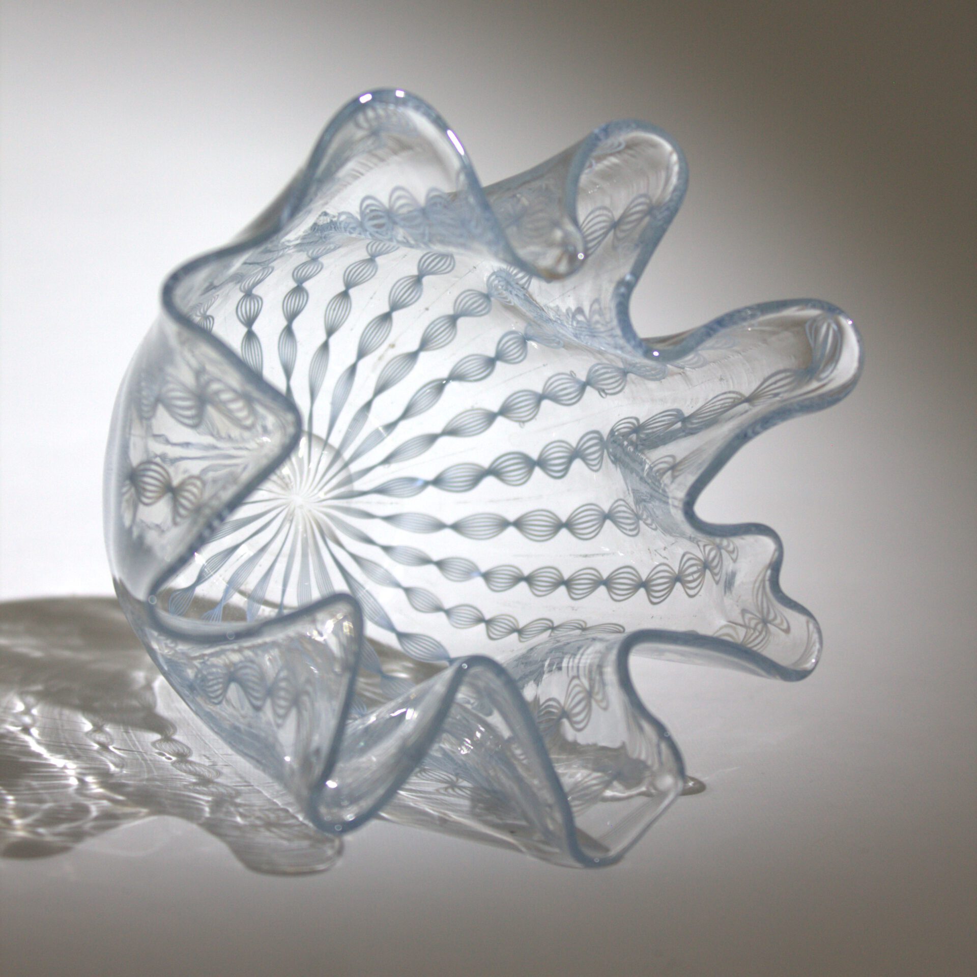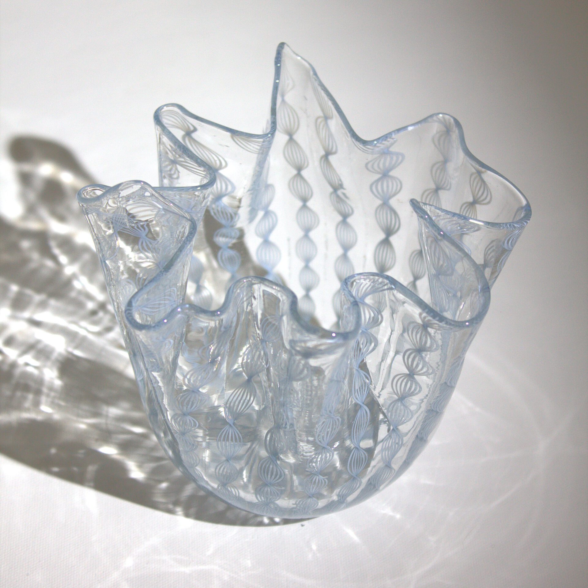 Fulvio Bianconi in in collaboration with Paolo Venini “Fazzoletto” (handkerchief) vase. Made by Venini & C., Murano, Italy c. 1950. Colorless glass with applied filigree Zanfirico-Ballottini bands in light blue.