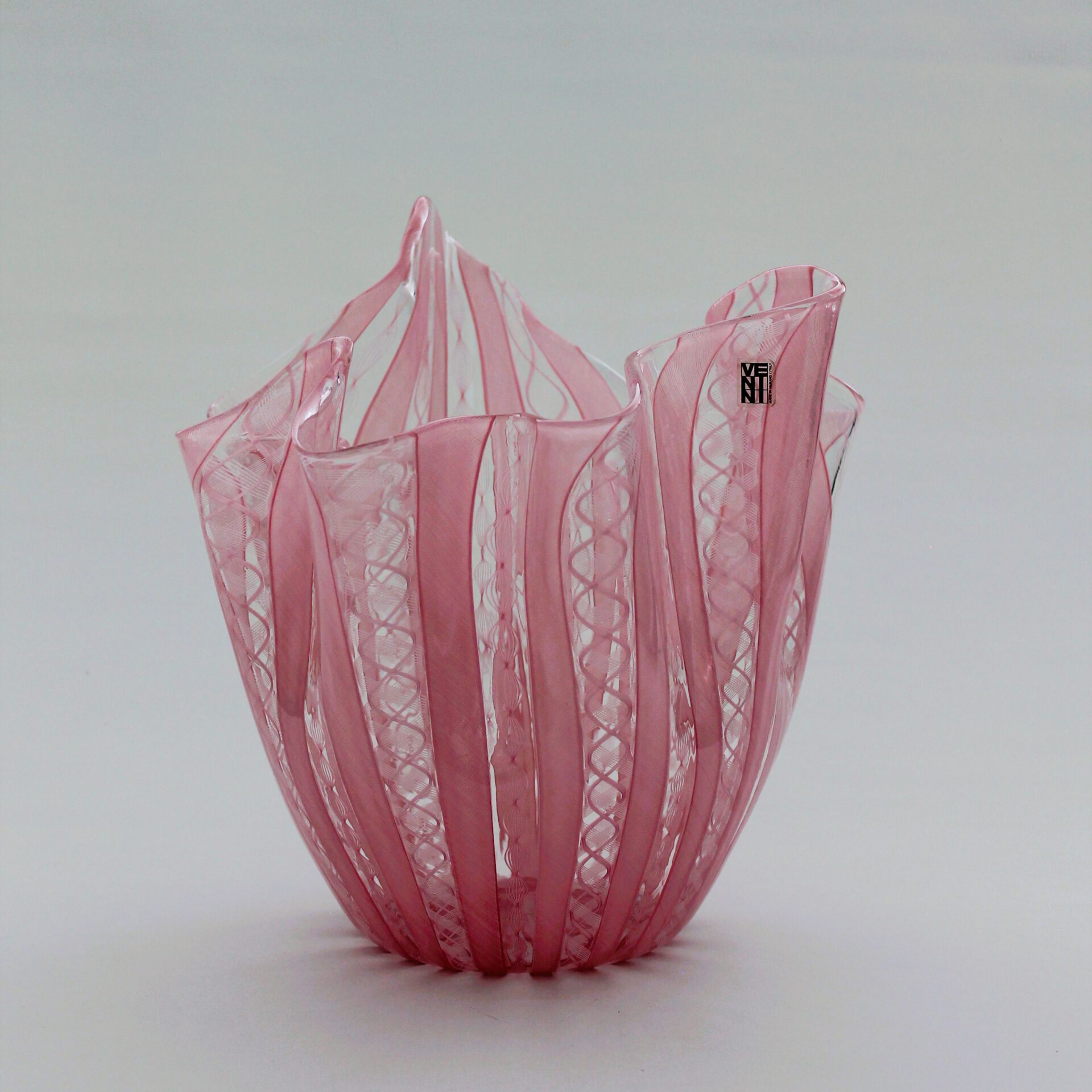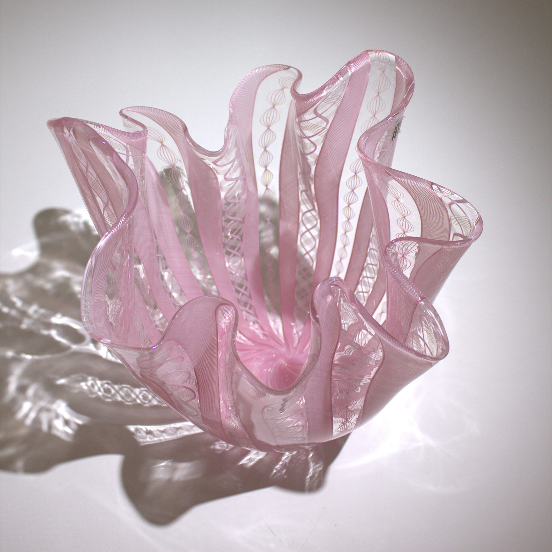 Fulvio Bianconi in in collaboration with Paolo Venini “Fazzoletto” (handkerchief) vase. Made by Venini & C., Murano, Italy c. 1970. Colorless glass with applied filigree Zanfirico, Reticello, and Ballottini bands in pink.