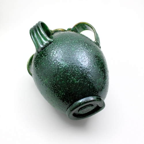 Notice: Napoleone Martinuzzi´s Pulegoso glass vases were never produced in large numbers of pieces. A smal group of pieces were produced for the exhibitions: „XVI Esposizione internazionale d’arte della città di Venezia“, 1928, and for the exhibitions: „Triennale delle arti decorative di Monza“ 1930. This rare, oversized „Quattro Anse“ Pulegoso vase, which becomes presented here, shows in the form of the well-known classical roman amphora-style. Its diffuse-translucent, bubbly emerald green tinted glass, and the iridescent surface make it a great example of the Italian Novecento-epoch. Today these are rare Napoleone Martinuzzi Pulegoso vases icons of pre-war Italian art and design and very popular.