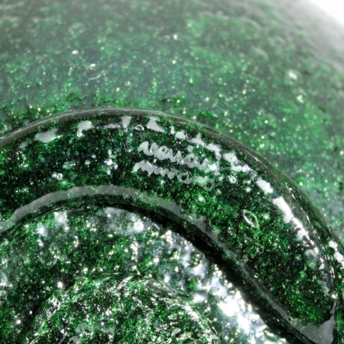 Hergestellt bei Venini & C., Murano-Italien. Dunkelgrün getöntes, stark moussierendes, Pulegoso-Glas mit dichter unregelmäßiger Blasenbildung. Ringförmig umschmolzene Mündungsrand, vier gerippte Glasbänder als Handhaben, ringförmiger Stand. (Modellnummer: 3120)